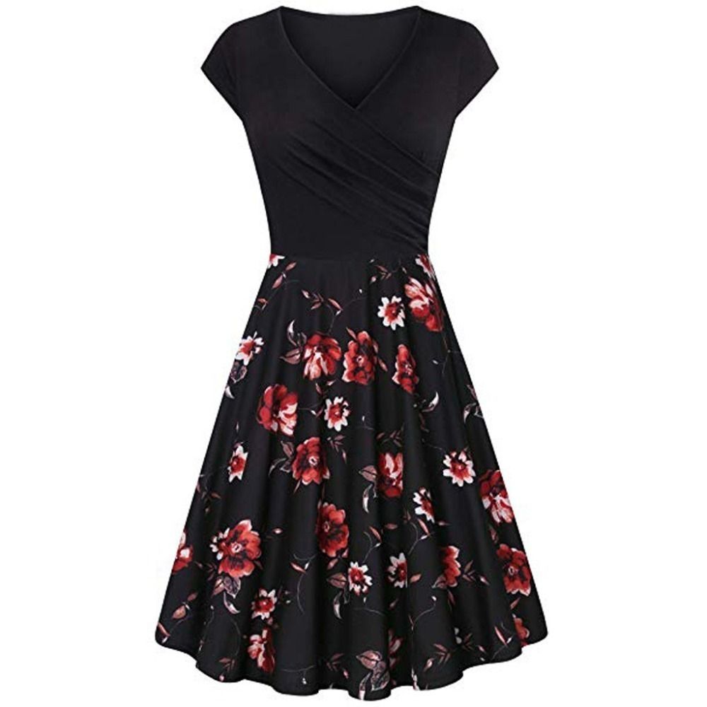 mavi siyah kisa kollu v yaka cicekli uzun elbise